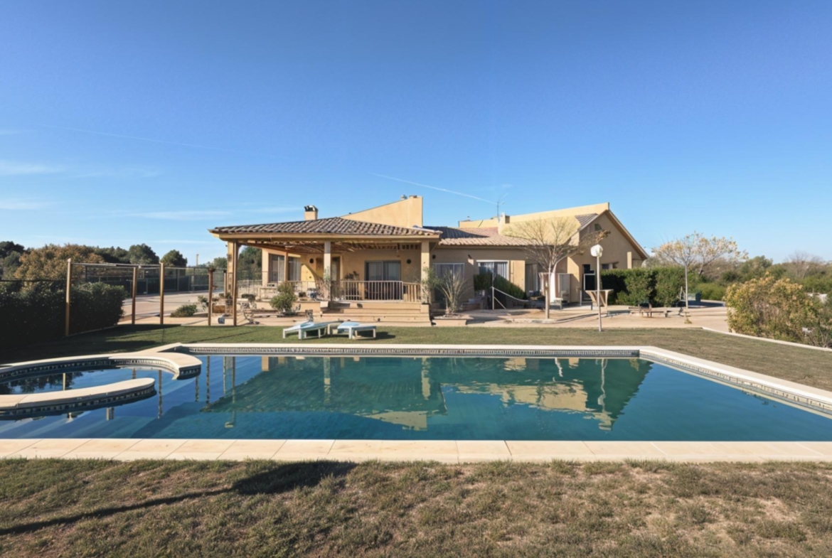 La vivienda cuenta con 385 m² construidos dentro de una impresionante parcela vallada de 21.900 m², con amplias zonas verdes, arbolado consolidado, sistema de riego automático y piscina privada, creando un espacio perfecto para disfrutar del exterior con total intimidad.
