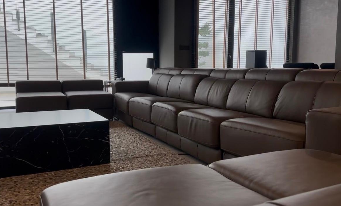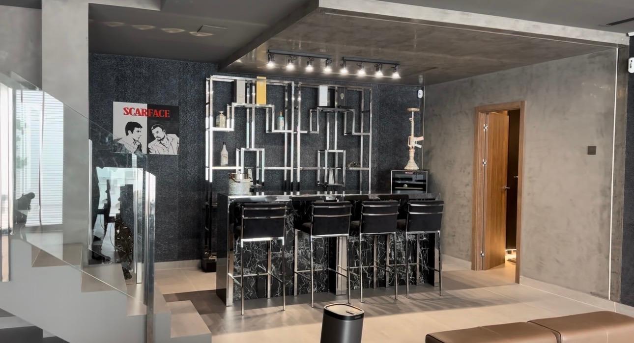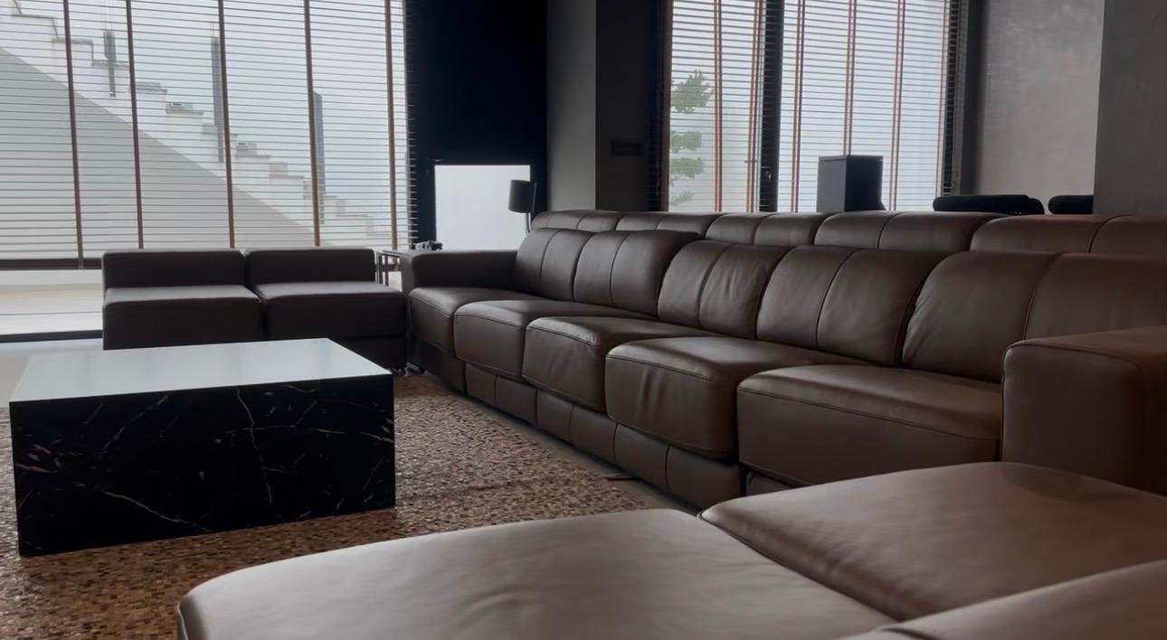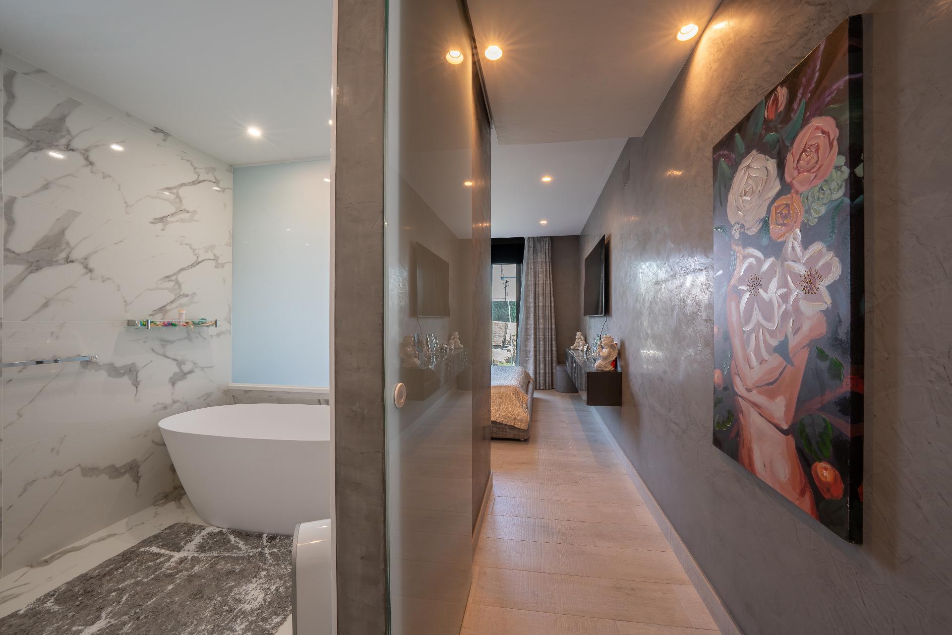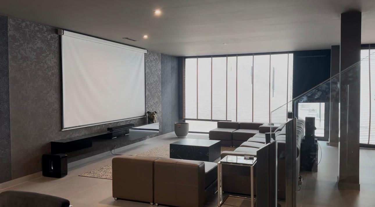 Planta Baja: Un espacio abierto y vibrante que alberga un amplio salón-comedor, un aseo de cortesía y un dormitorio ideal para invitados o despacho. El salón es el corazón de la casa, presidido por un canapé de cuero de lujo diseñado exclusivamente a medida para este espacio y una televisión con proyección de alta gama para tus noches de cine. Las paredes están vestidas con cuadros de arte exclusivo que aportan una personalidad única.