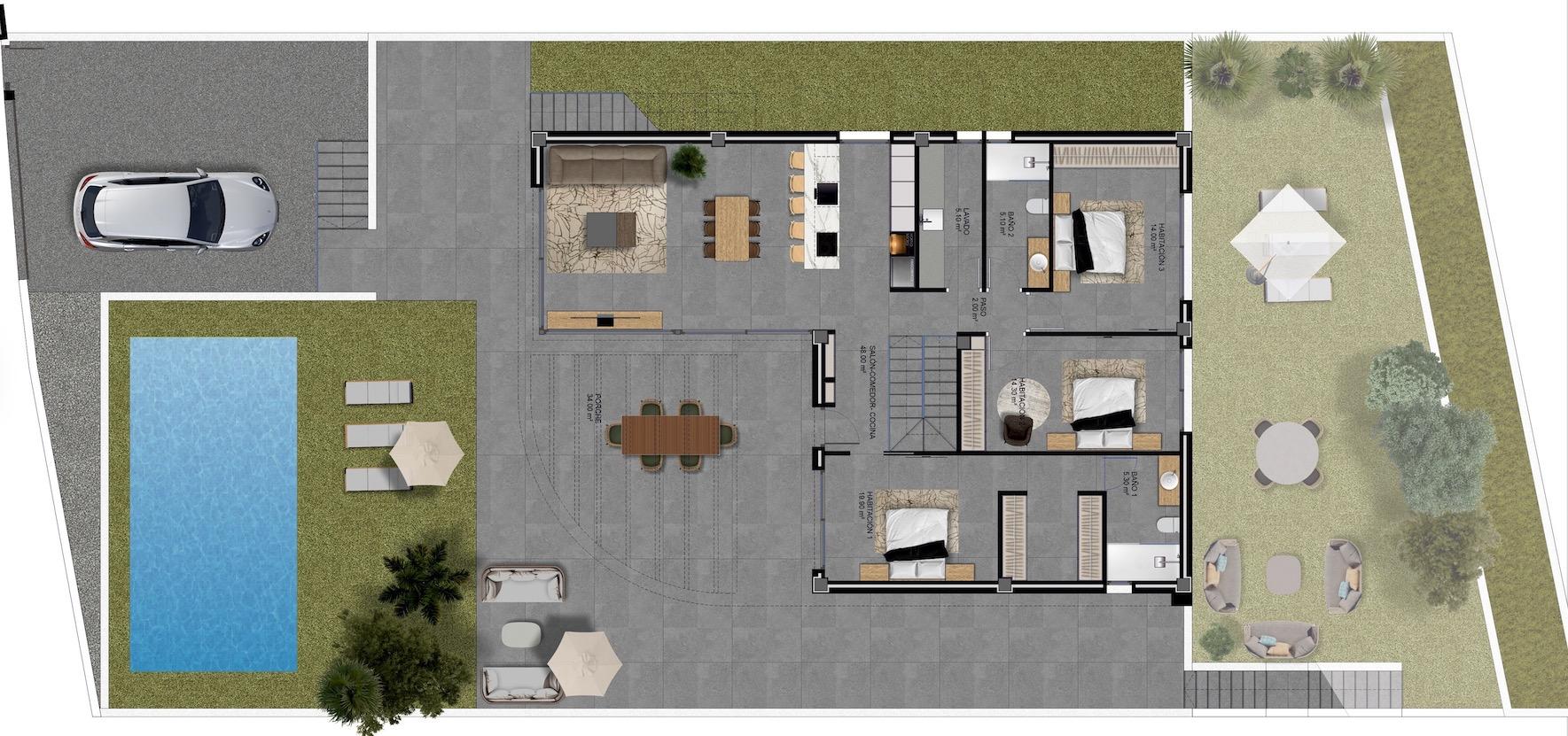Los patios están bellamente distribuidos, ofreciendo tanto una zona de playa junto a la piscina como una zona de barbacoa a la sombra. La parcela tiene 560 metros cuadrados, una rareza en Finestrat, especialmente a este precio. La altura de los techos, tanto en la planta principal como en la planta baja, es de 280 cm; ¡enséñeme otra casa con estancias tan amplias! Esto es crucial y realza la sensación de espacio. Eche un vistazo a los planos; estoy seguro de que apreciará esta villa.
